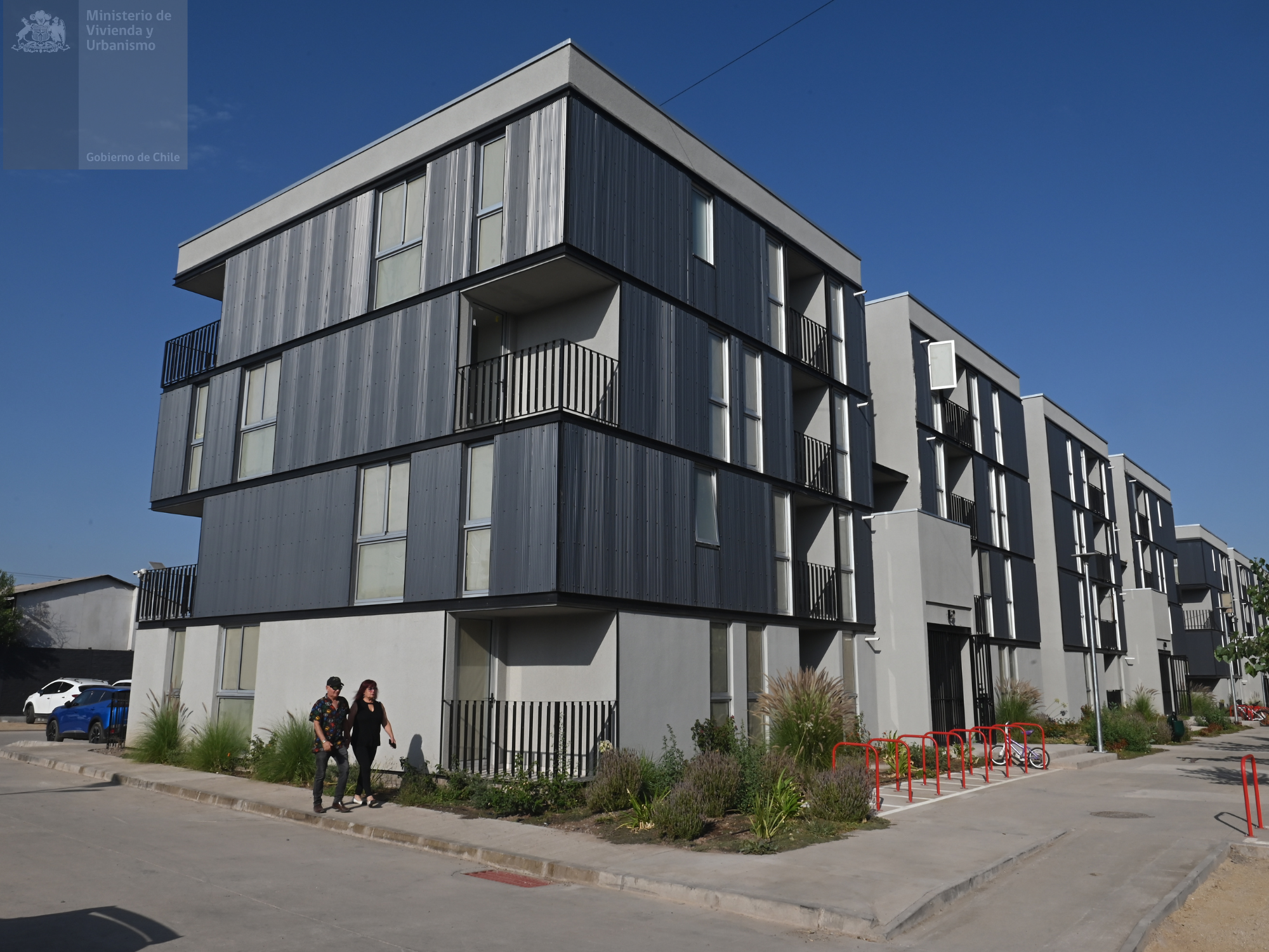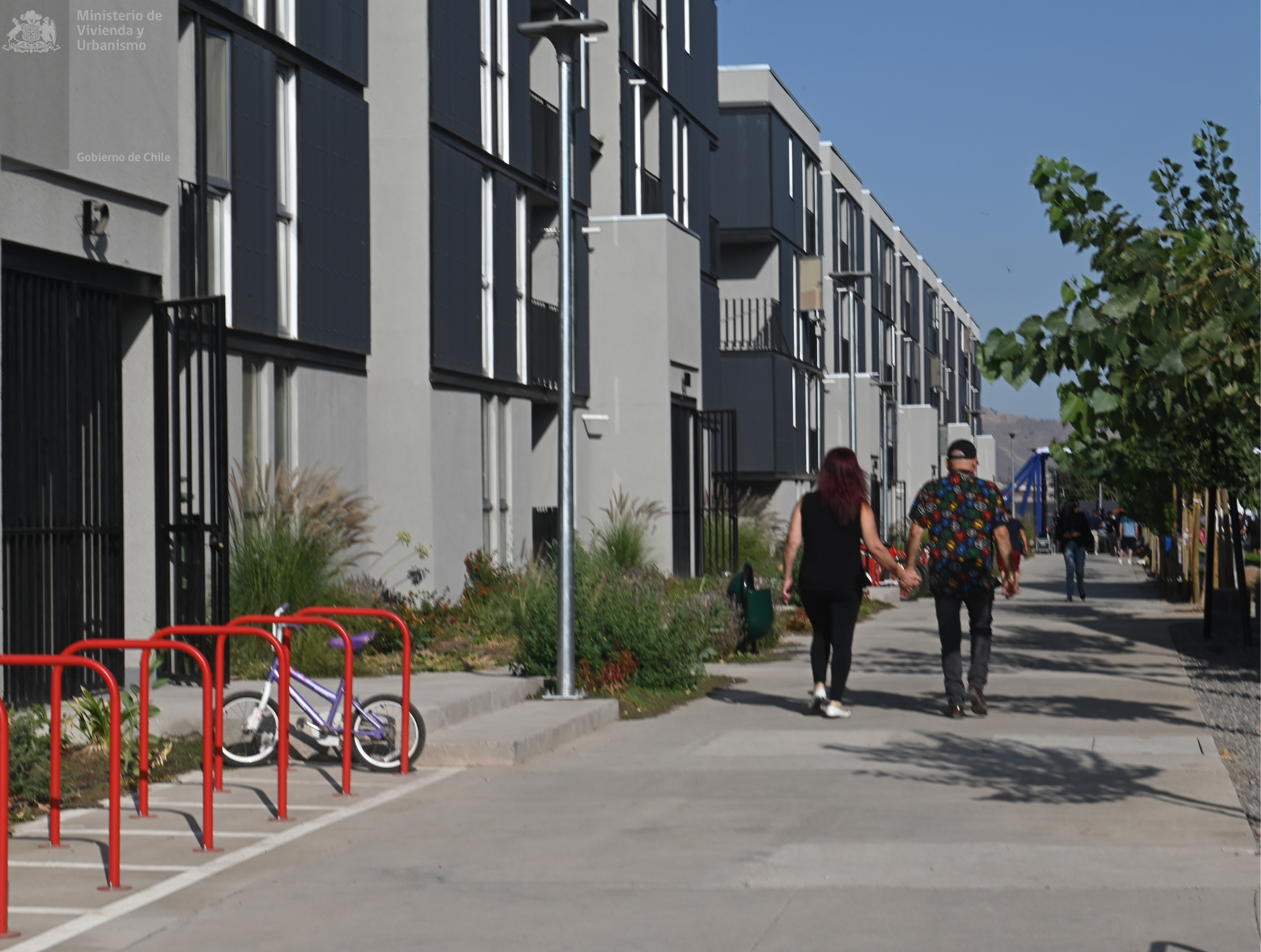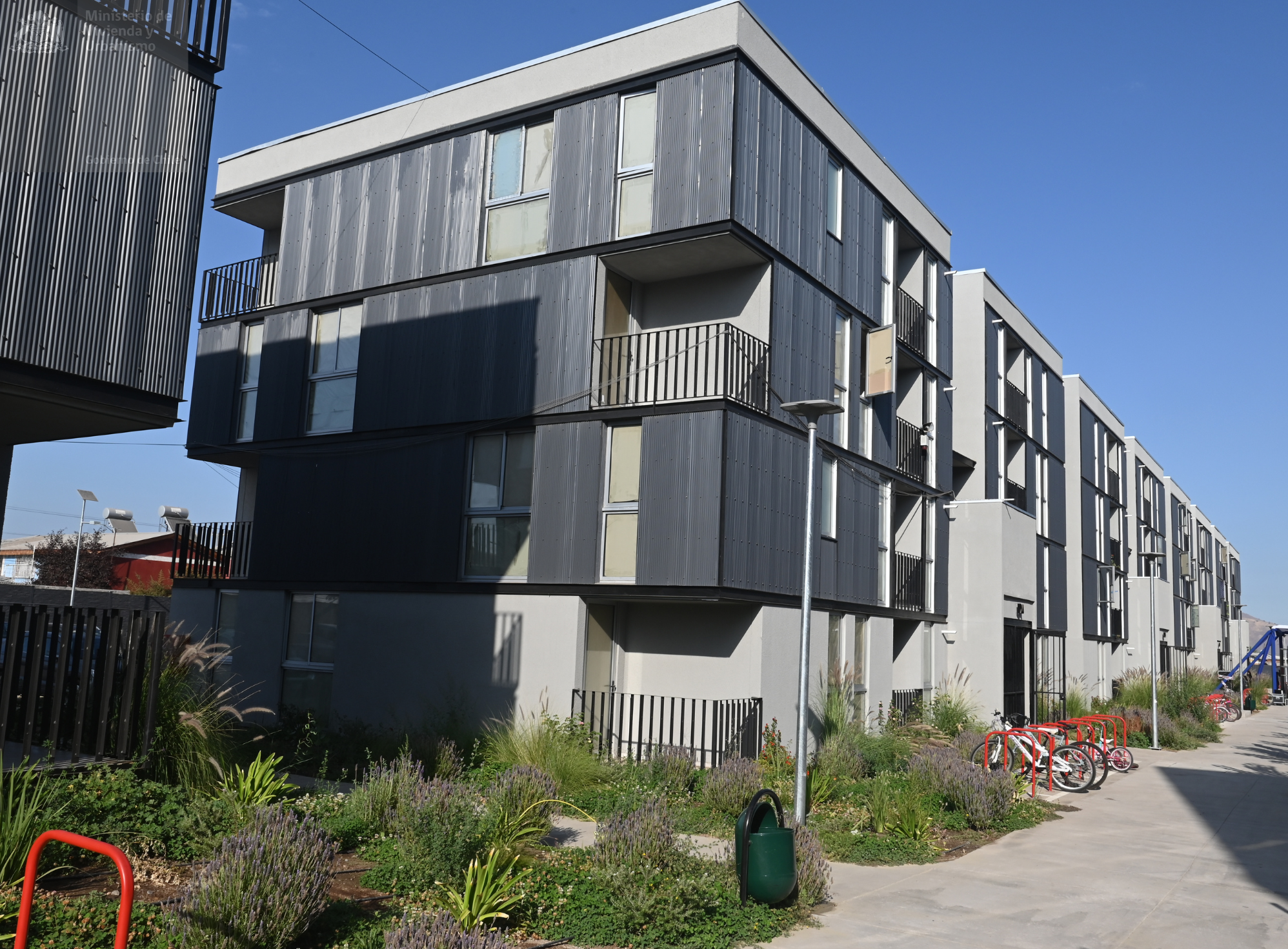 Set de 4 fotos, donde se puede apreciar un conjunto con alto estándar constructivo, contempla en su diseño y materialidad aspectos de eficiencia energética como una envolvente opaca eficiente y ventanas termopanel que generan mayor confort térmico y acústico en las viviendas. Las áreas comunes consideran aspectos de eficiencia hídrica a través de la optimización del riego y la plantación de especies con bajo consumo de agua. Se proyectaron luminarias con sistemas fotovoltaicos para la iluminación de las áreas comunes.