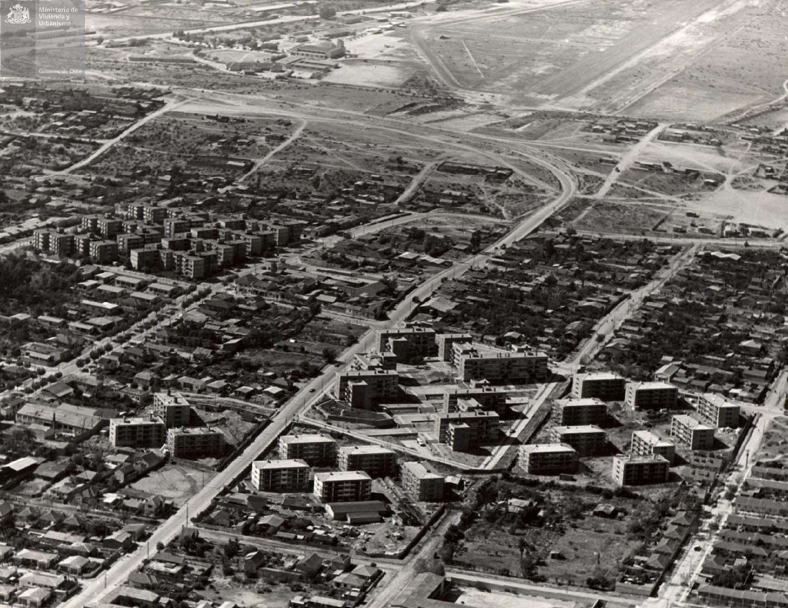 Vista aerea de la población Esmeralda de Quilpué. Monobloques que corresponden a las tipología 1010 (los edificios sin alero) y a los 2020 (con aleros).
