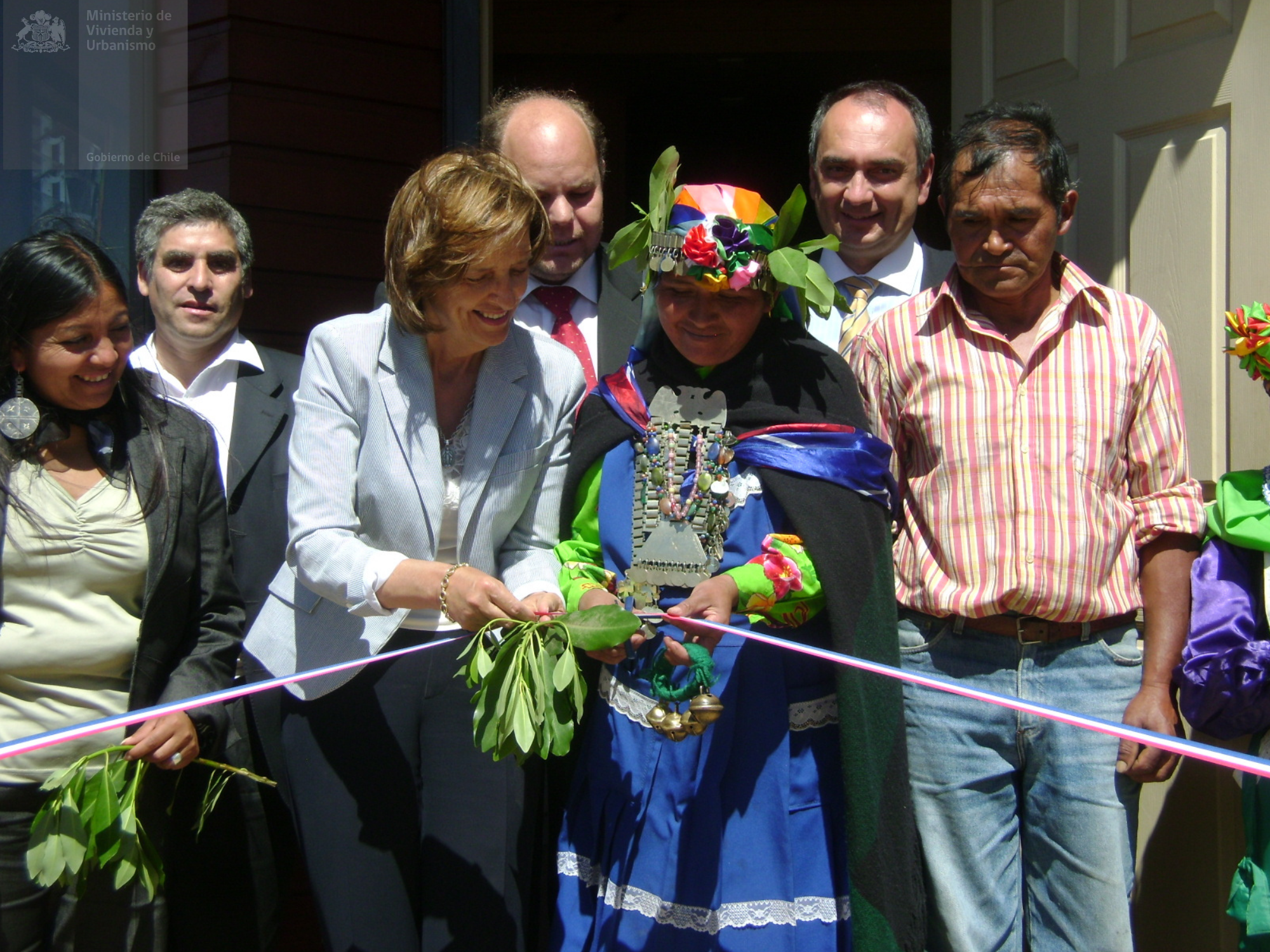 Set de 3 fotos; donde se puede apreciar (3a. imagen) a la Ministra de Vivienda y Urbanismo (2006-2010) Patricia Poblete Bennett inaugurando Conjunto Habitacional Casa de la Machi. Cabe destacar que el Comité de Machis de Chol Chol, que impulsó la gestión de estas soluciones habitacionales, se formó para resolver la necesidad de vivienda de las familias de estas mujeres, que ejercían la medicina mapuche.