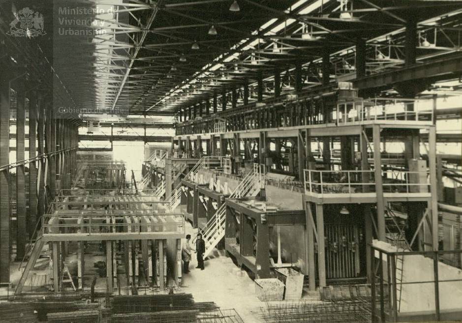 Fotografías del proceso de fabricación de los forjados prefabricados de hormigón (plattenbau) tomadas por Miguel Santiagos T., disponibles en el libro "Planta KPD: reseña gráfica del proceso de producción y montaje de los primeros elementos prefabricados por la Planta K.P.D."