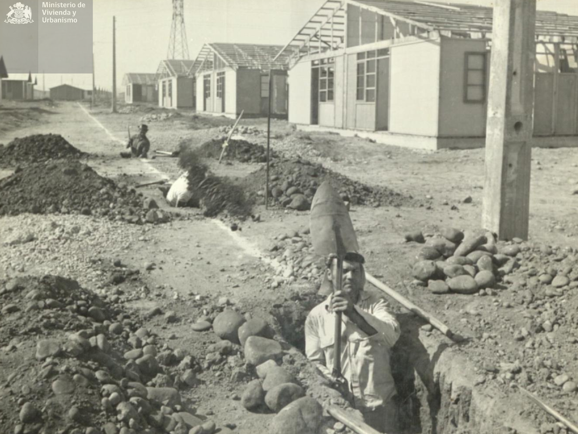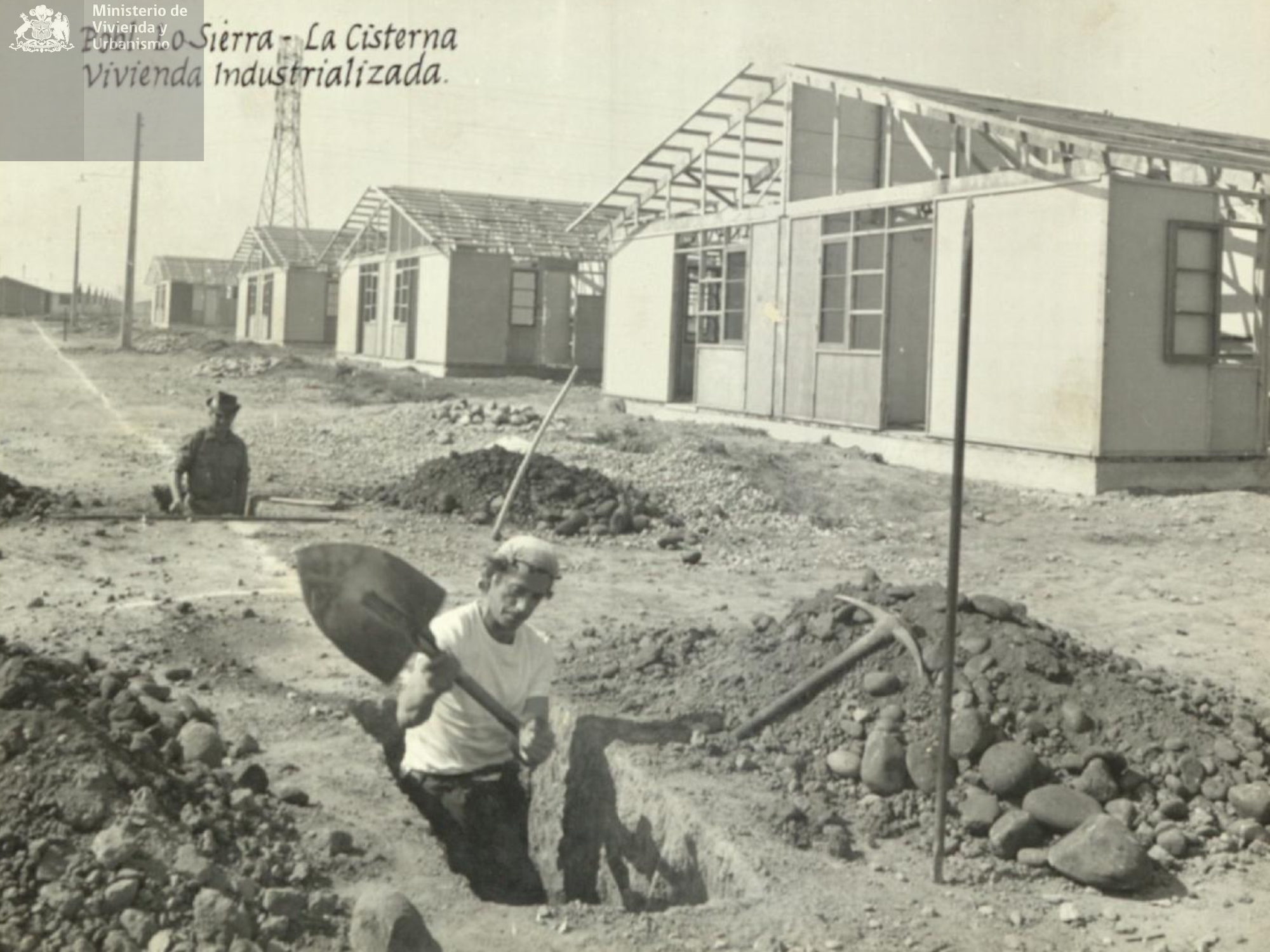 Como se puede apreciar en set de 2 fotos, obreros proceden con las terminaciones de construcción de viviendas industrializadas Corvi correspondientes a la Población Lo Sierra de la comuna de La Cisterna.