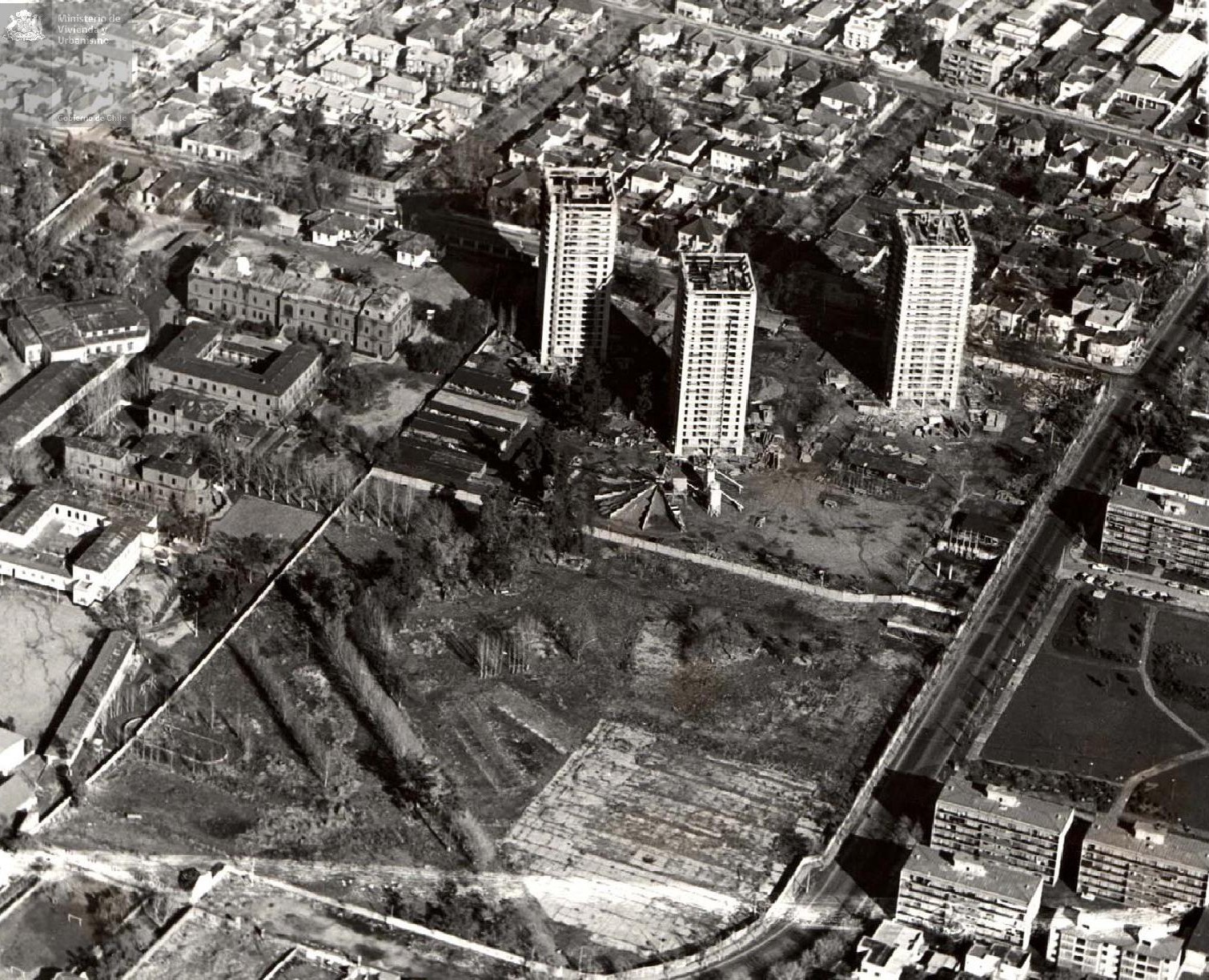 Vista aérea de la Remodelación Parque Inés de Suarez, corresponden a viviendas de arrastre de la CORVI. Estas torres forman parte de un ambicioso proyecto de remodelación en un predio de 27 Hás, 18 de las cuales quedaron destinadas a parque comunal.