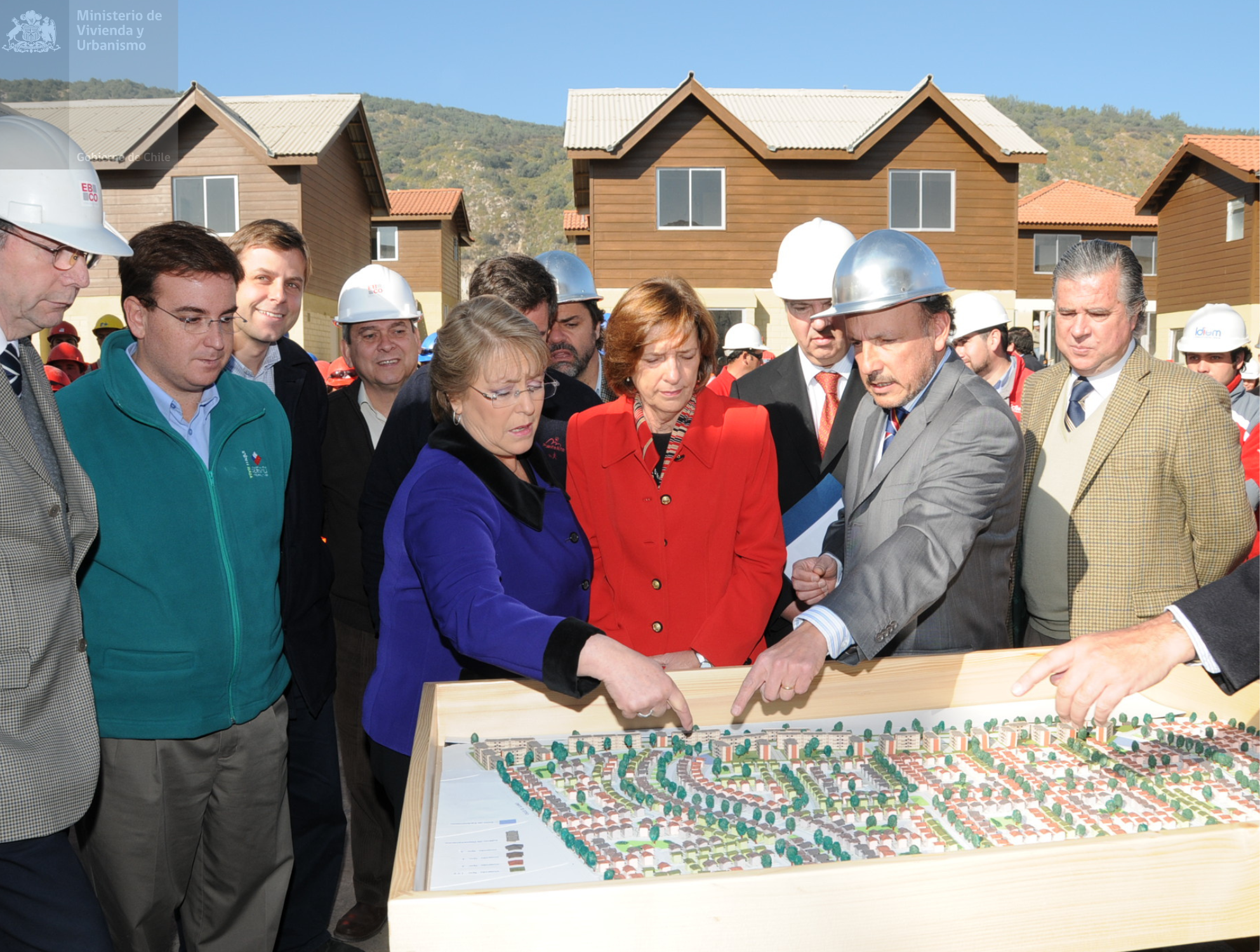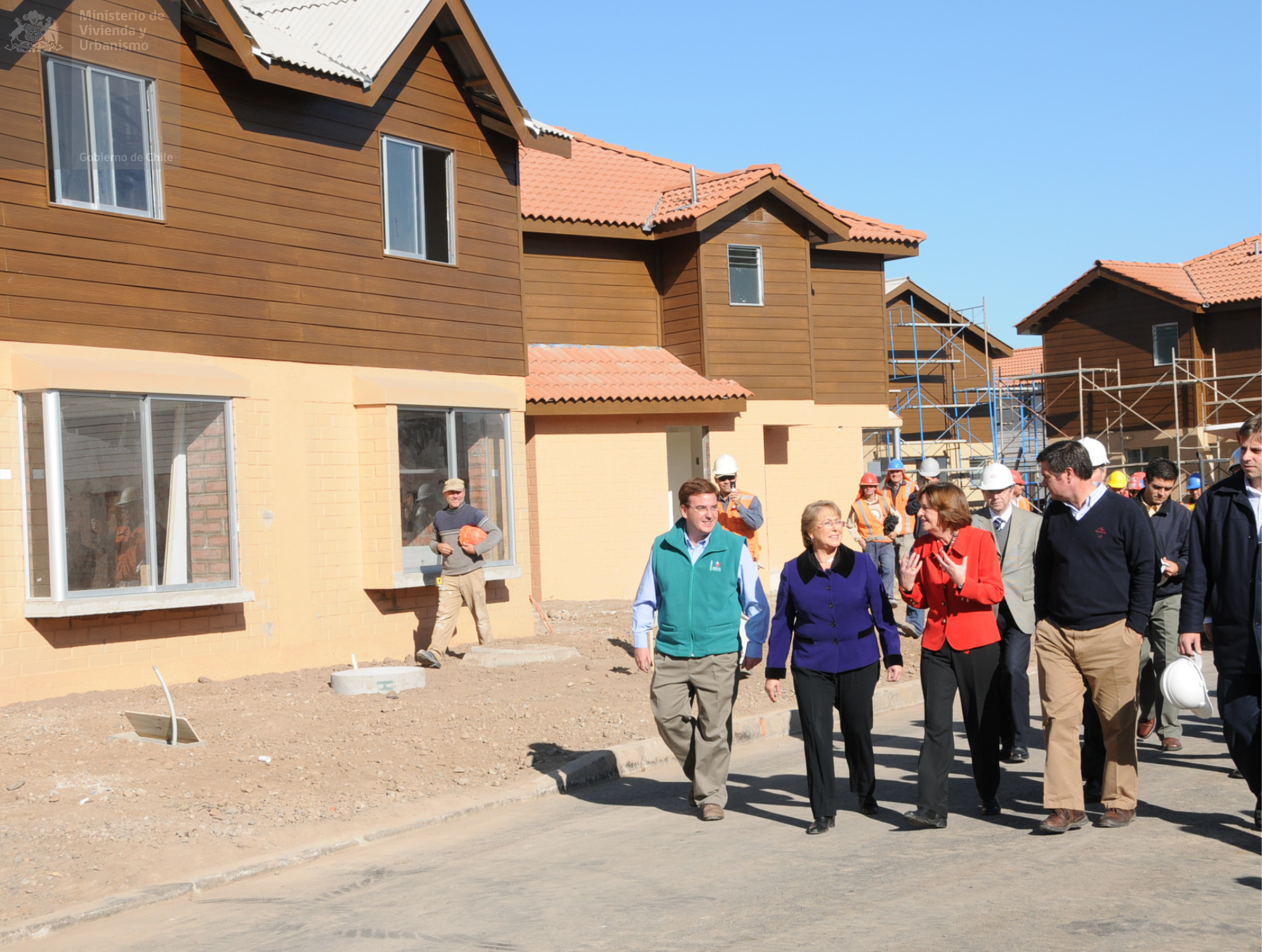Set de 4 fotos donde se puede apreciar (2a. y 3a. imagen), a Presidenta Michelle Bachelet Jeria (período 2006-2010), junto a Ministra de Vivienda y Urbanismo Patricia Poblete Bennett en visita a las obras de construcción del Proyecto de Integración Social San Alberto de Casas Viejas en comuna de Puente Alto. Es importante destacar que la oferta diversa de tipologías fue parte del esfuerzo de desarrollo del conjunto, cuidando evitar la generación de barrios homogéneos, para lo que también se invirtió en el diseño del conjunto y la distribución de calles, antejardines, cierros, pasajes, áreas de juego y plazas.