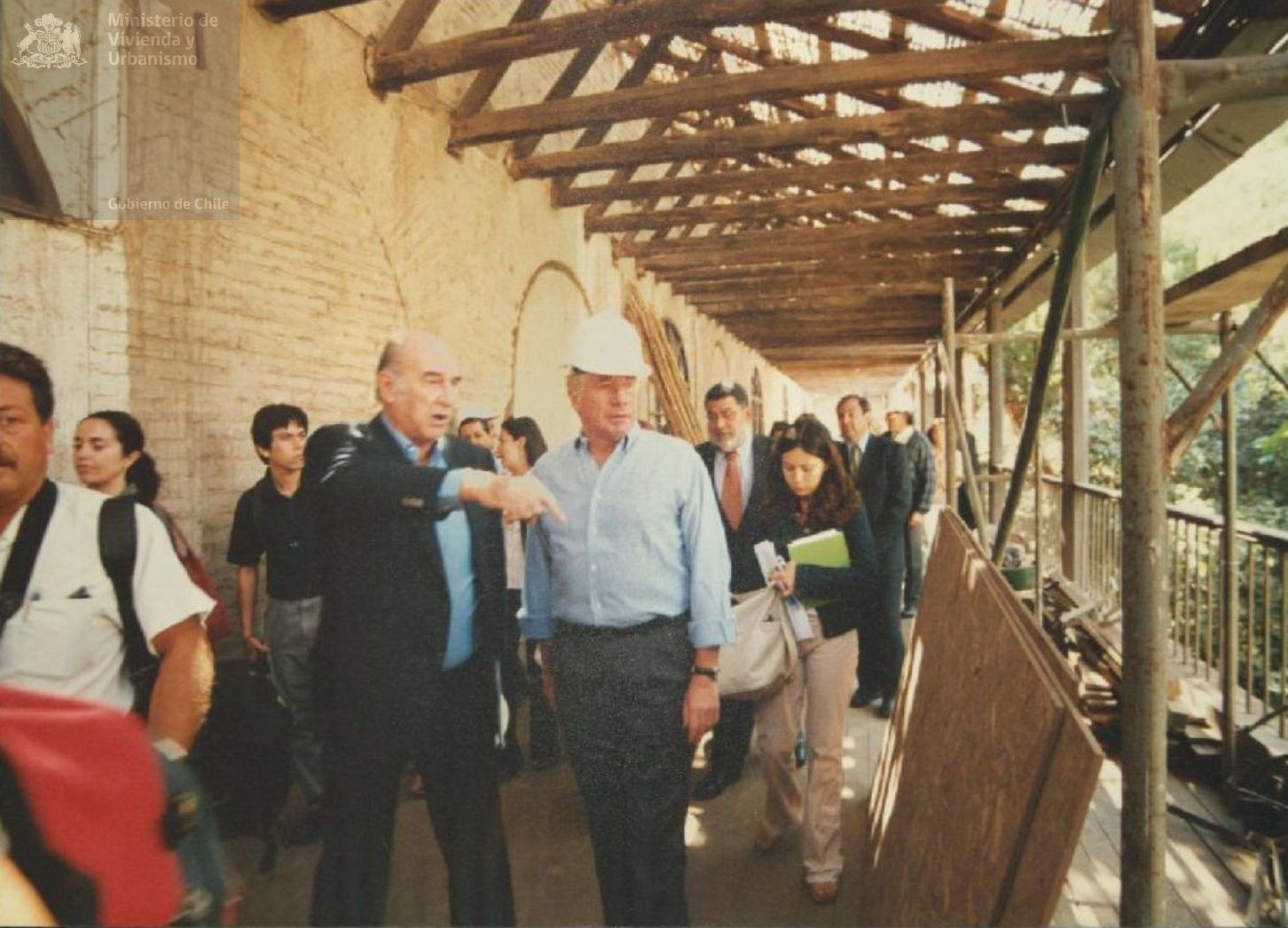 Visita del Ministro Jaime Ravinet a la Iglesia San Francisco de Santiago para inspeccionar la reparación de la techumbre.