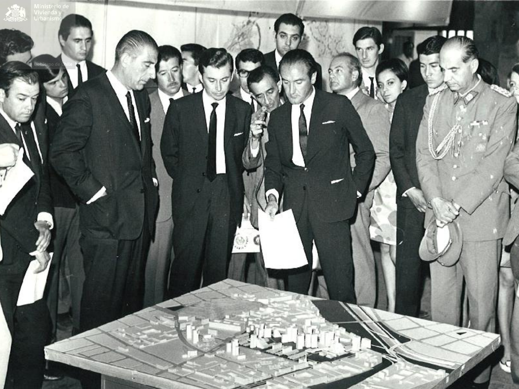 El Presidente Eduardo Frei Montalva junto a Ministro de Vivienda Juan Hamilton y otros personeros de gobierno observan la maqueta de Remodelación San Borja.