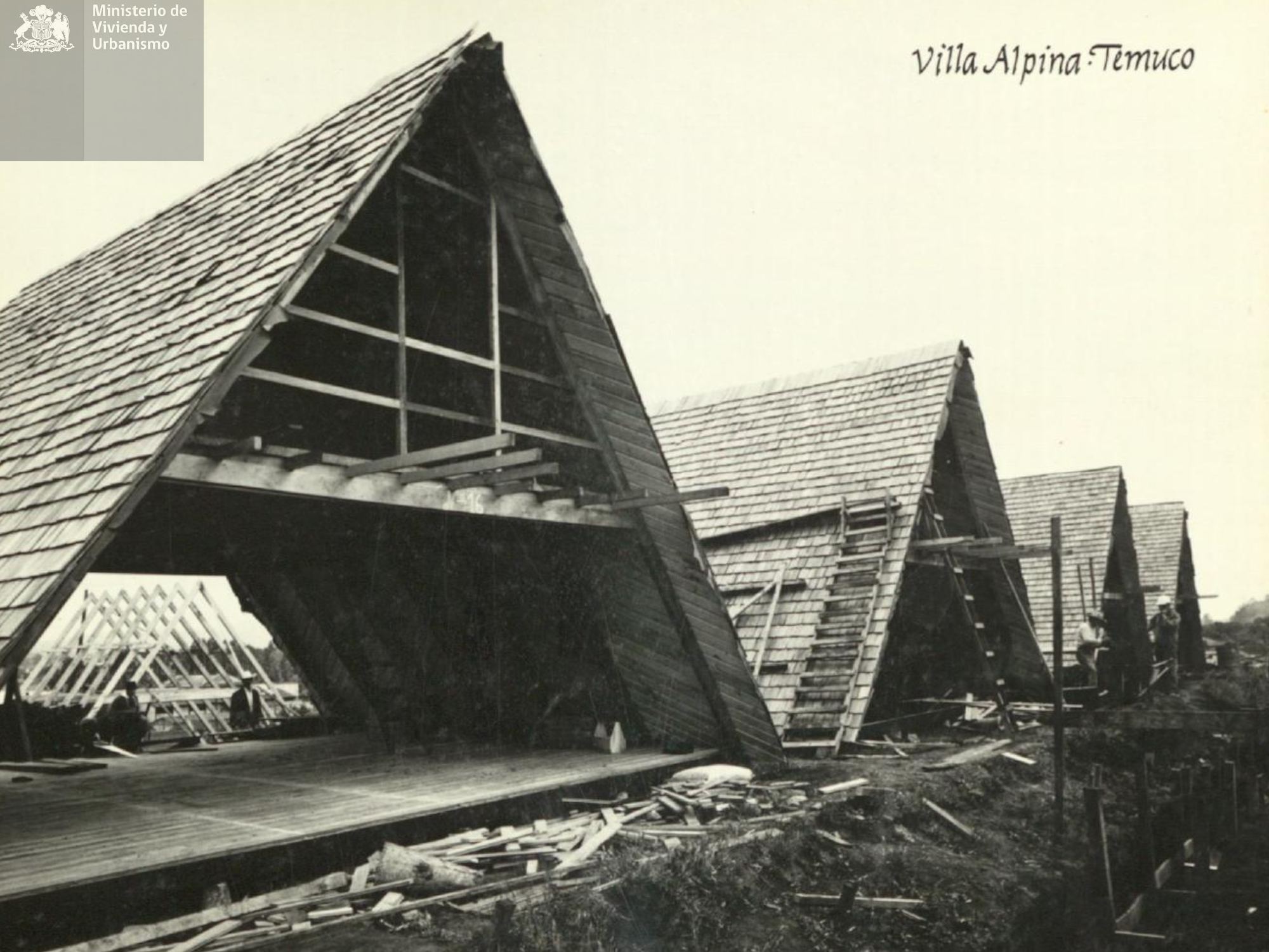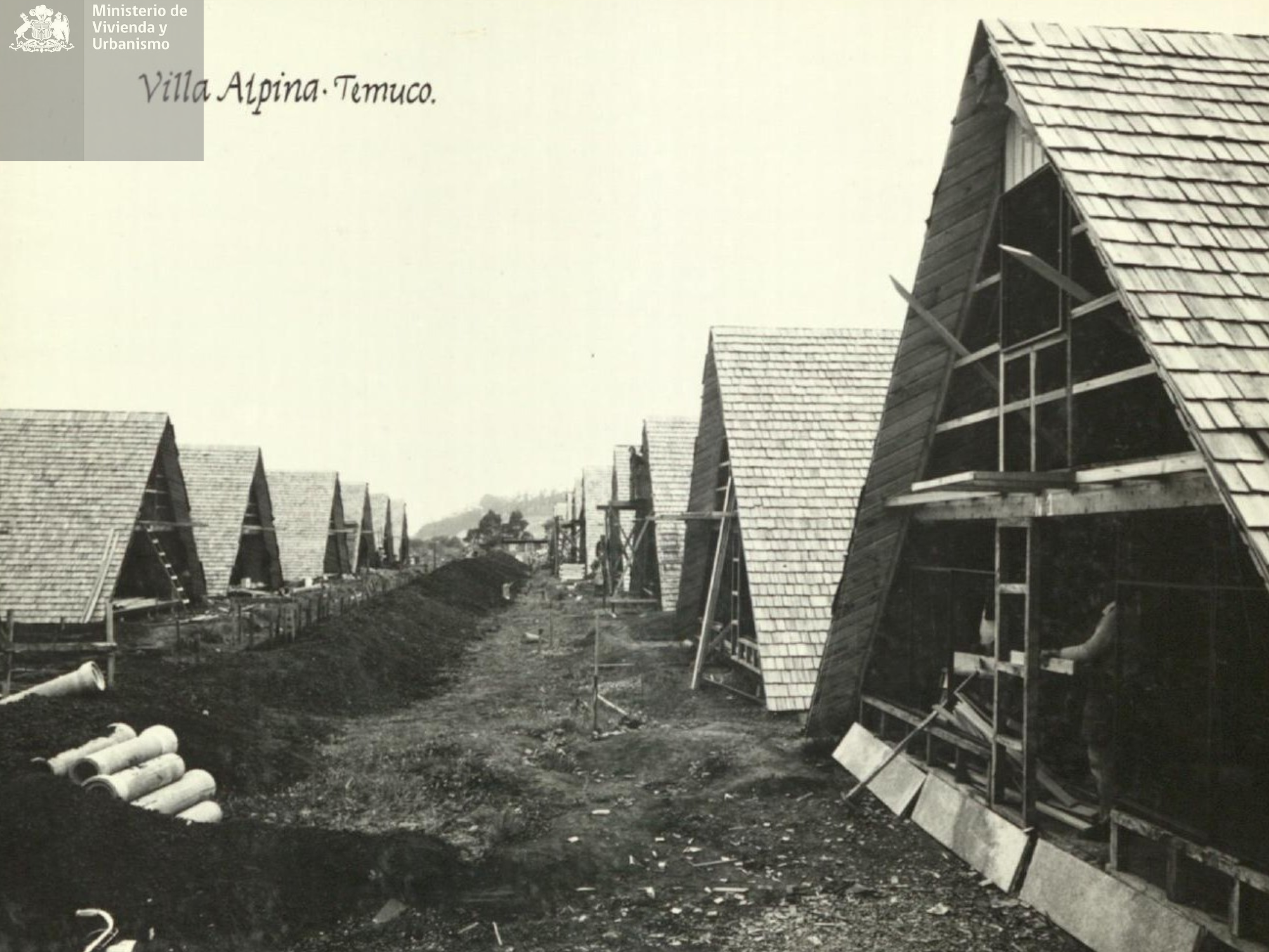 Como se puede apreciar en set fotográfico, el conjunto habitacional Villa Alpina de Temuco, se erige como una solución emblemática en cuanto al uso de paneles prefabricados tipo A de fácil construcción; lo que trae como consecuencia positiva la buena resistencia al viento y la lluvia propios de la zona geográfica.