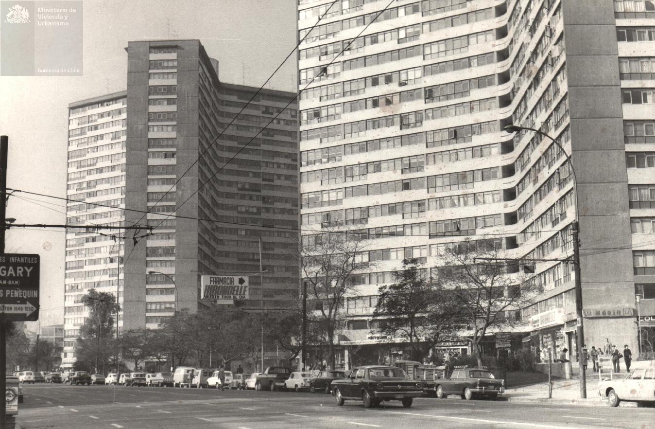Remodelación Providencia. Torres gemelas de Carlos Antunez en forma de 'Y'. En 1968 ya terminadas eran los edificios habitacionales más grandes de Santiago con 1.220 residentes en 660 departamentos.