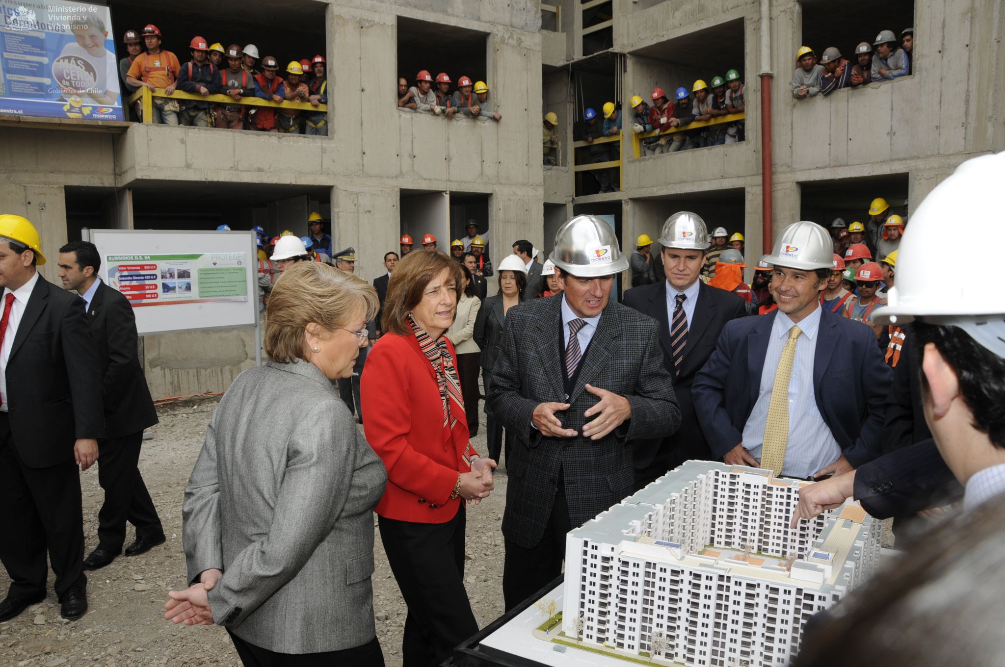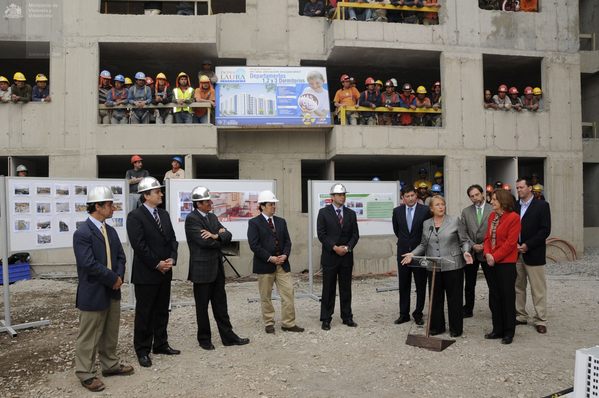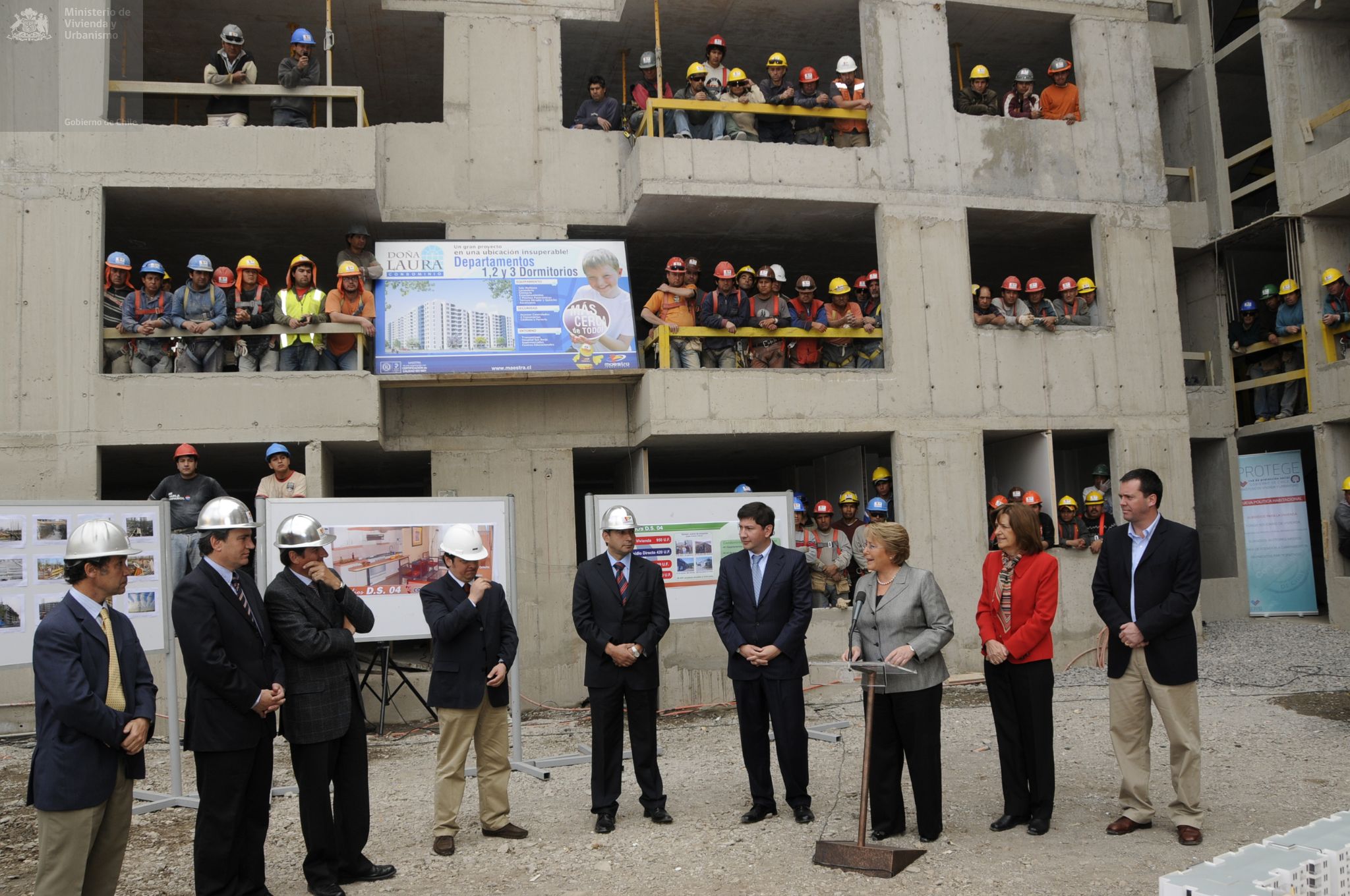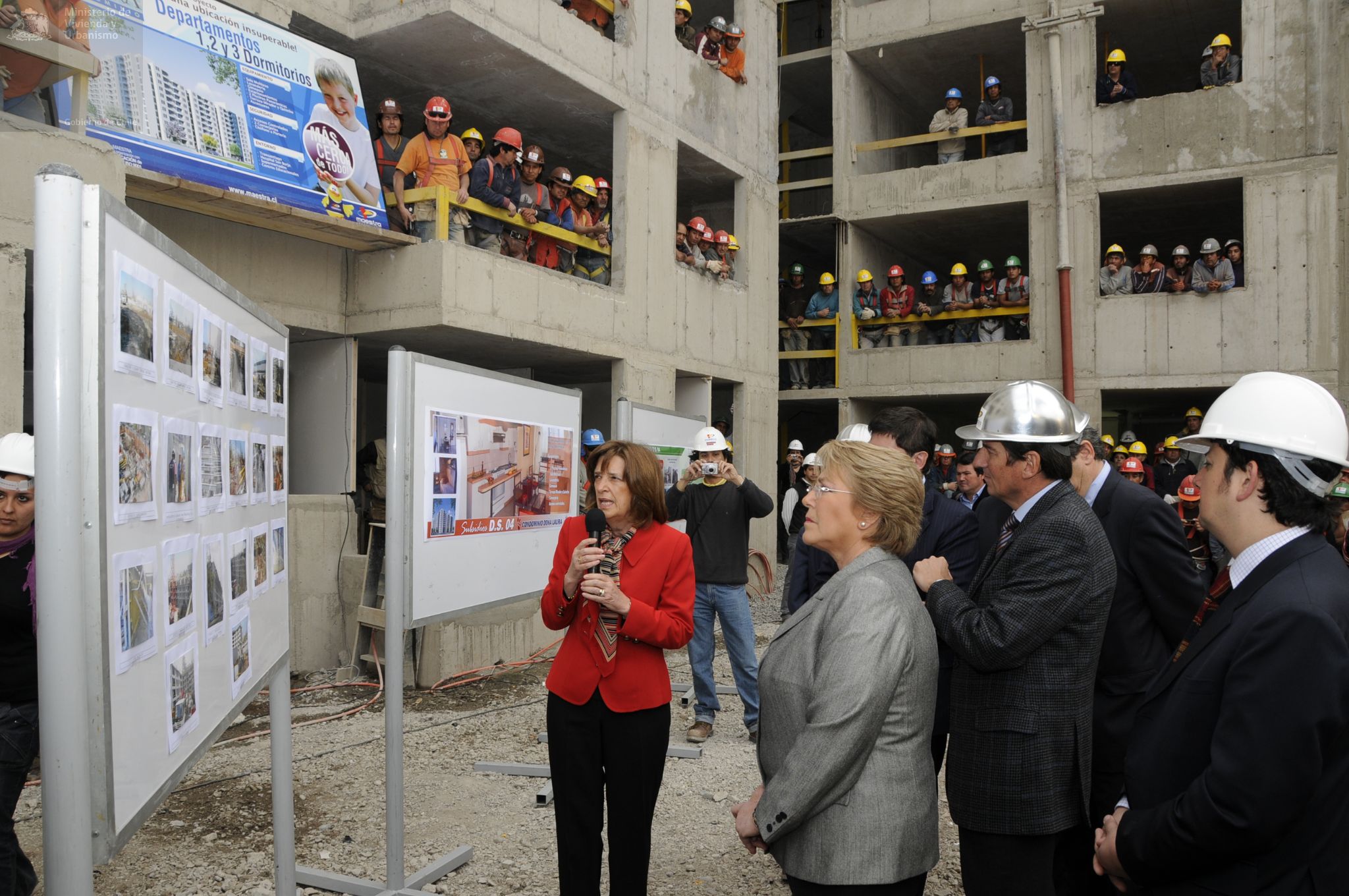 Visita de la Presidenta Michelle Bachelet y la Ministra Patricia Poblete a la construcción de condominio Doña Laura, en Calle Victoria en Santiago Centro. En este proyecto se puede optar a una casa a través de Subsidio de Vivienda DS 04, que reglamenta la adquisición de viviendas económicas y préstamos de enlace a corto plazo a las empresas constructoras.