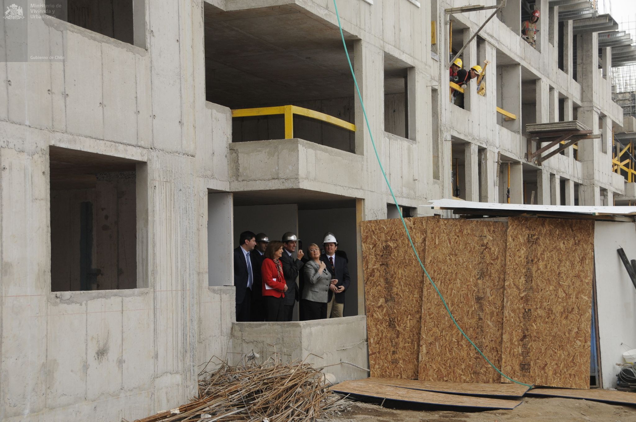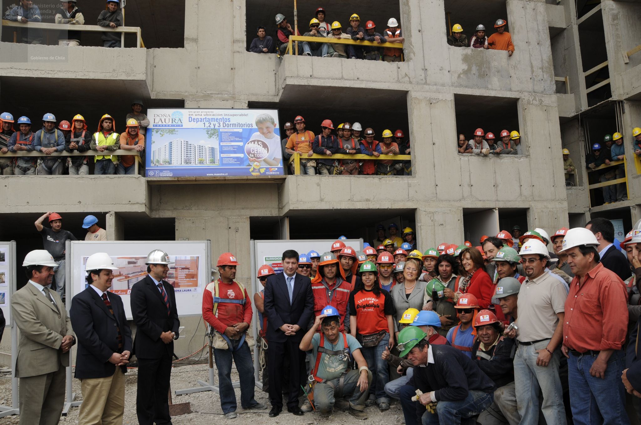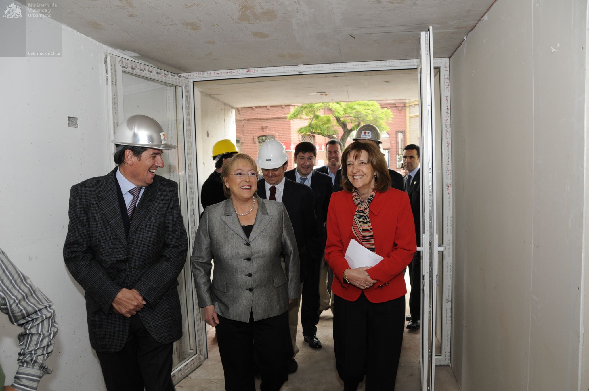 Visita de la Presidenta Michelle Bachelet y la Ministra Patricia Poblete a la construcción de condominio Doña Laura, en Calle Victoria en Santiago Centro. En este proyecto se puede optar a una casa a través de Subsidio de Vivienda DS 04, que reglamenta la adquisición de viviendas económicas y préstamos de enlace a corto plazo a las empresas constructoras.