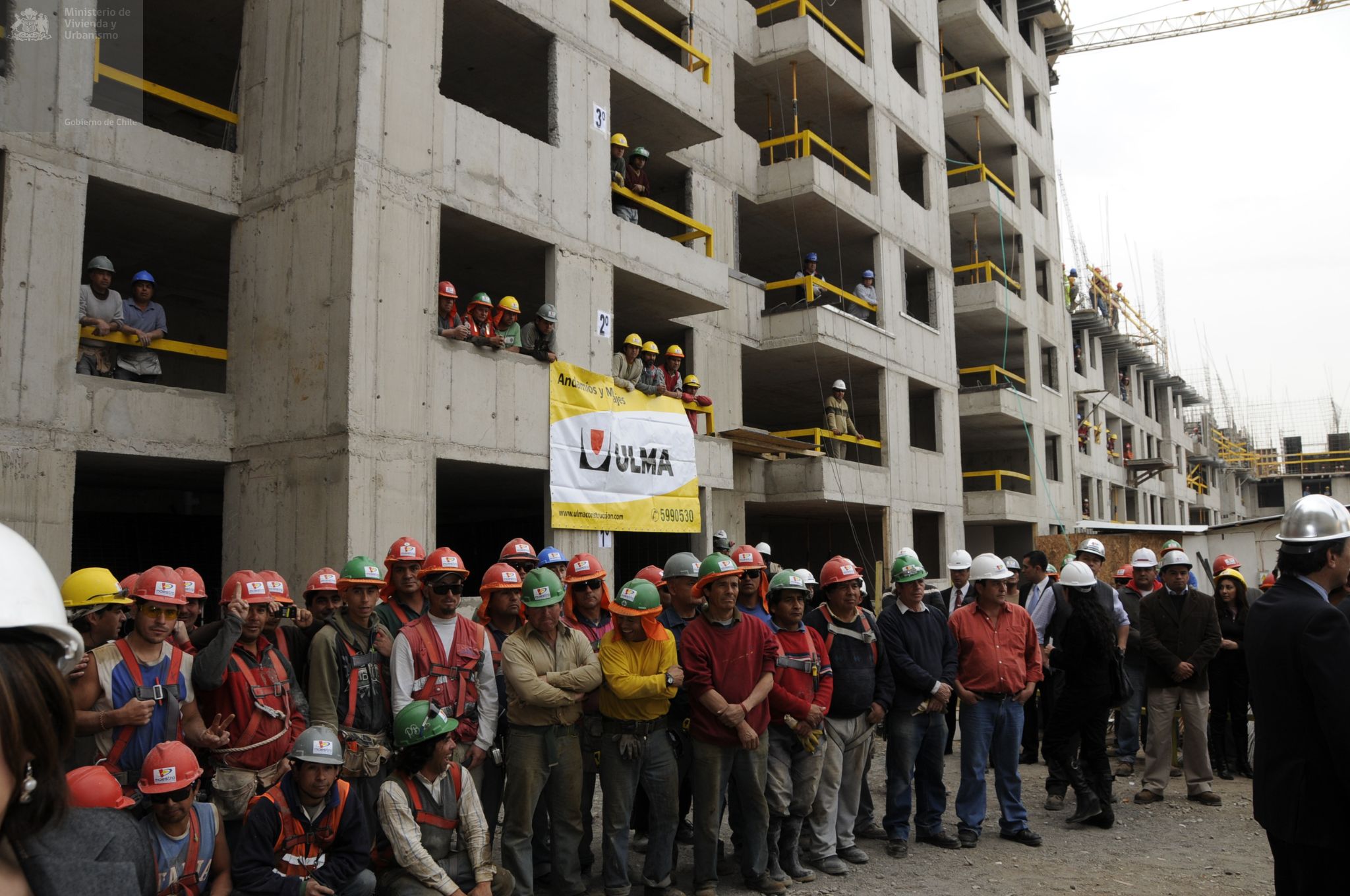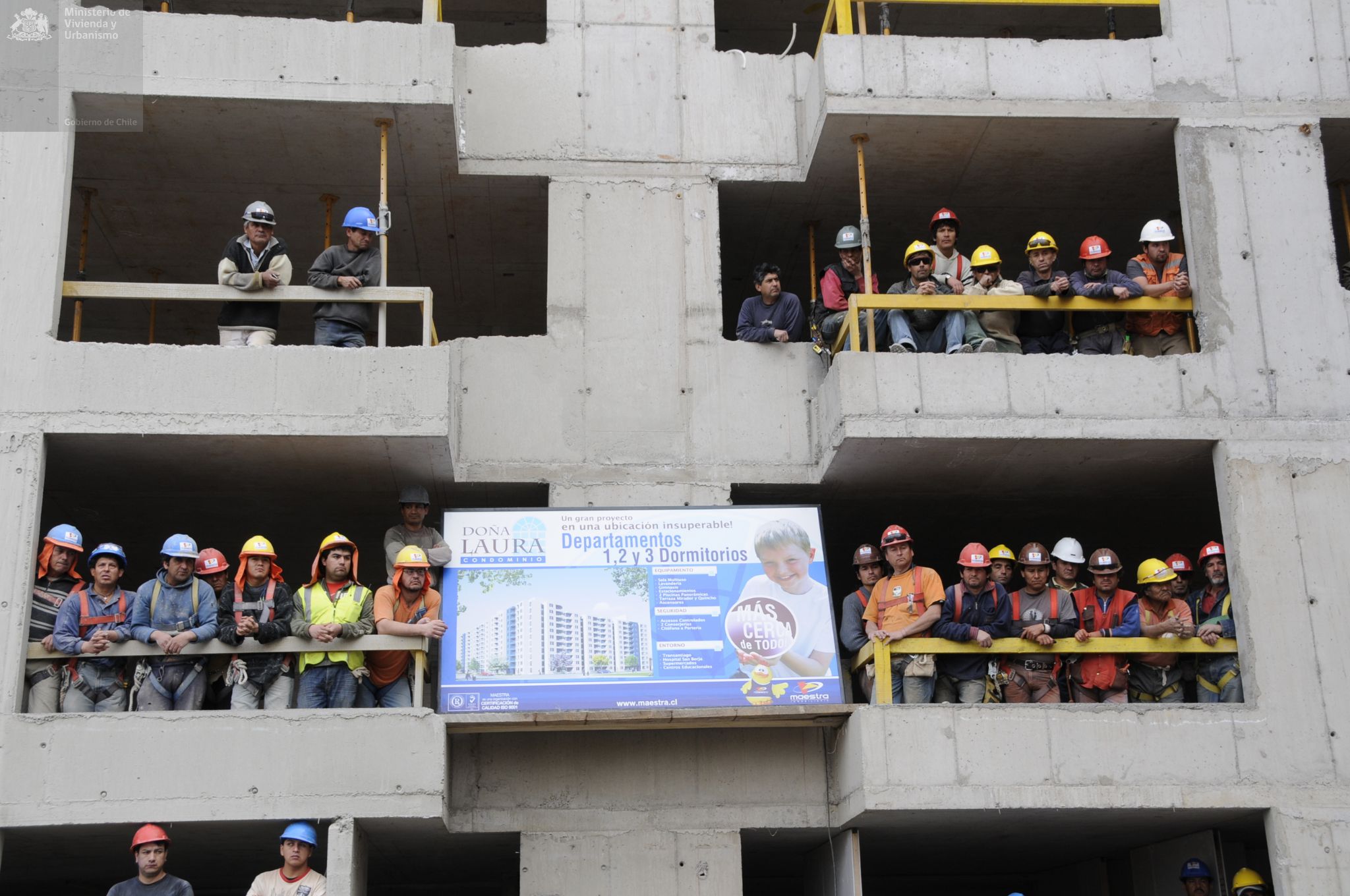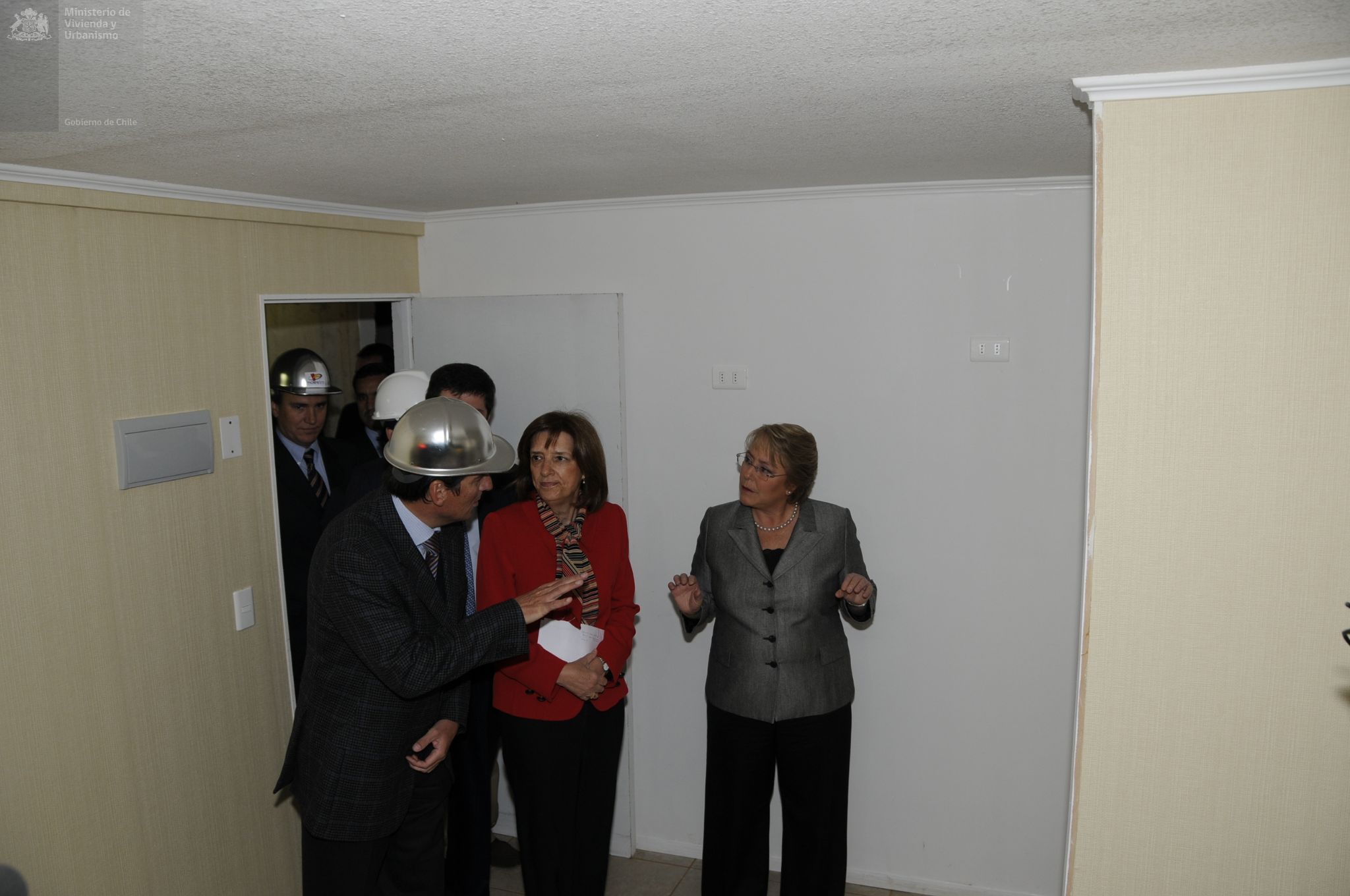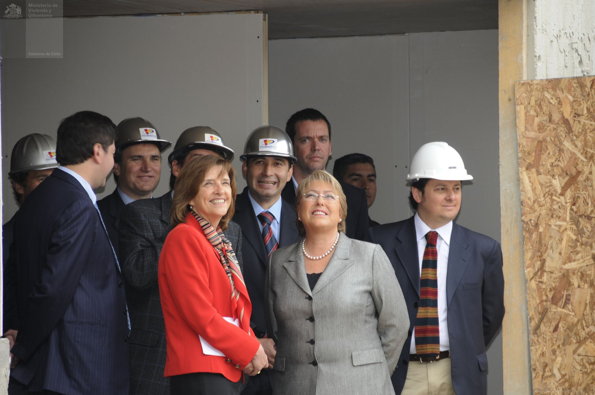 Visita de la Presidenta Michelle Bachelet y la Ministra Patricia Poblete a la construcción de condominio Doña Laura, en Calle Victoria en Santiago Centro. En este proyecto se puede optar a una casa a través de Subsidio de Vivienda DS 04, que reglamenta la adquisición de viviendas económicas y préstamos de enlace a corto plazo a las empresas constructoras.