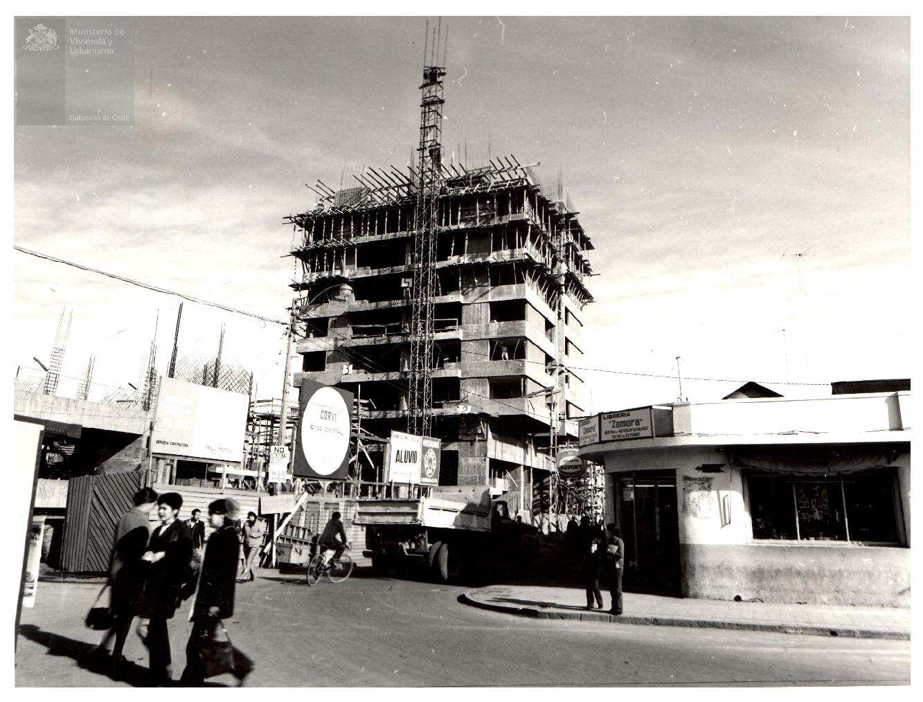 Edificio consistorial de Rancagua. Construcción de hormigón armado de 15 pisos, constituido por una placa inferior de dos niveles destinado a oficinas, y una torre hito de carácter habitacional.