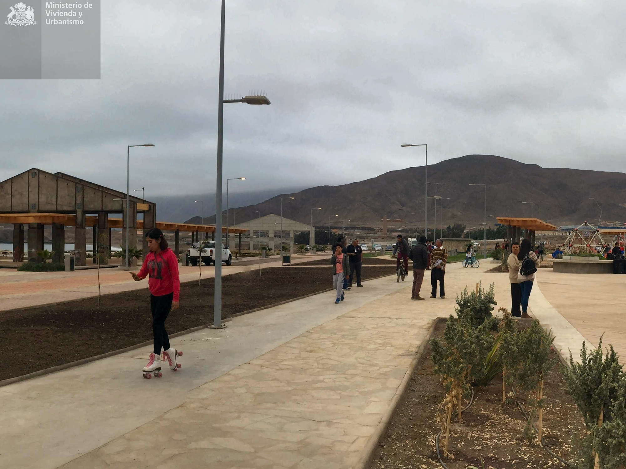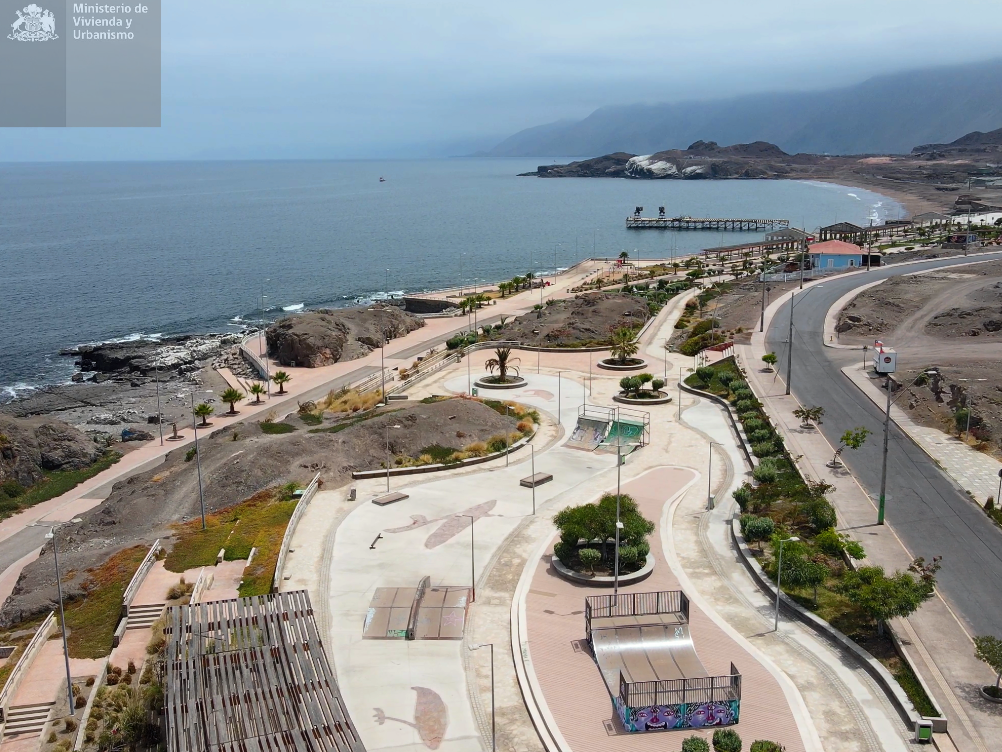 El proyecto también releva la herencia cultural de los pueblos originarios, incorporando en el pavimento del parque pictografías replicadas de la Quebrada del Médano. Todo ello se enmarca en un diseño paisajístico de carácter desértico, que realza el contraste entre el azul del mar, los cerros ocres y el cielo blanco-azulado característico de las ciudades costeras del norte.